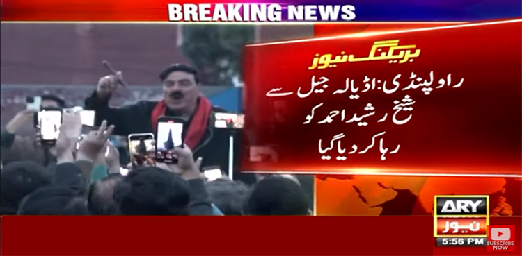 جیل سے باہر آنے پر شیخ رشید کا والہانہ استقبال کیا گیا۔ ان پر پھولوں کی پتیاں نچھاور کی گئیں اور کارکنان نے انہیں کندھوں پر بٹھا لیا۔