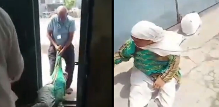 ویڈیو میں دیکھا جاسکتا ہے کہ بزرگ خاتون سیکیورٹی گارڈ کی منت سماجت کرتی رہی اور سیکیورٹی گارڈ نے بزرگ خاتون کو گھسیٹ کر گیٹ سے باہر نکال دیا۔
