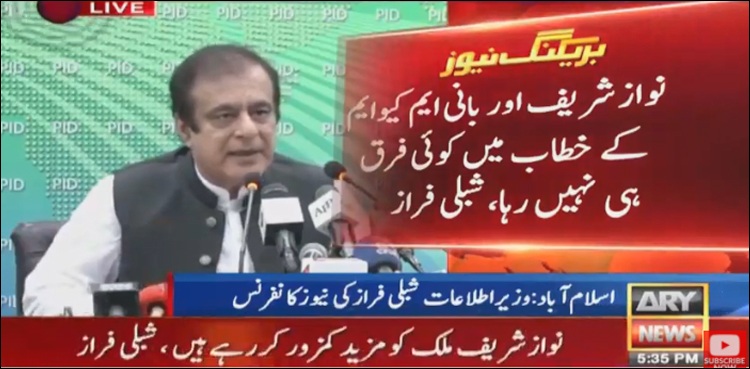 اسلام آباد میں نوازشریف کی تقریر پر ردعمل دیتے ہوئے شبلی فراز کا کہنا تھا کہ آج ایک ایسا شخص ملک کے خلاف تقاریر کررہا ہے جہاں سے اُس نے اربوں ڈالر غیر قانونی طریقے سے کمائے۔