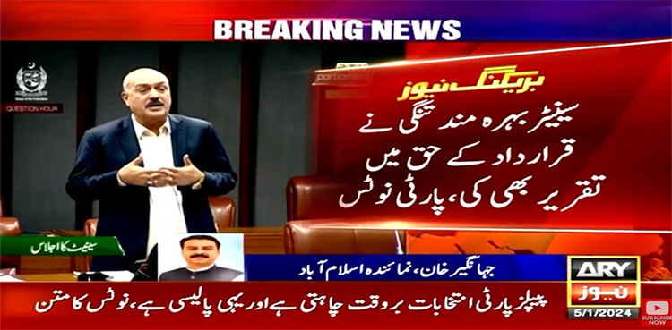 پیپلزپارٹی نے انتخابات ملتوی کرنے سے متعلق سینیٹ سے منظور ہونے والی قرارداد پر سینیٹر بہرہ مندتنگی کو پارٹی پالیسی کی خلاف ورزی پر شوکاز نوٹس جاری کر دیا۔