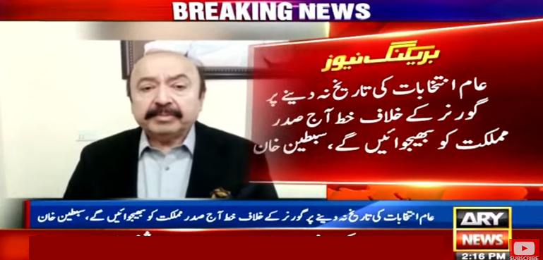 پاکستان تحریک انصاف کے رہنما سبطین خان نے کہا ہے کہ انتخابات کی تاریخ نہ دینے پر ہم صدر مملکت کو گورنر پنجاب کے خلاف خط لکھ رہے ہیں۔