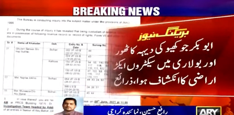 ذرائع کا کہنا ہے کہ ابوبکرجوکھیو کی دیہہ کاٹھور اوربولاری میں سینکڑوں ایکڑ اراضی کا انکشاف ہوا، اراضی تین سال میں ابوبکر جوکھیو کے اہل خانہ کے نام منتقل کرائی گئی۔