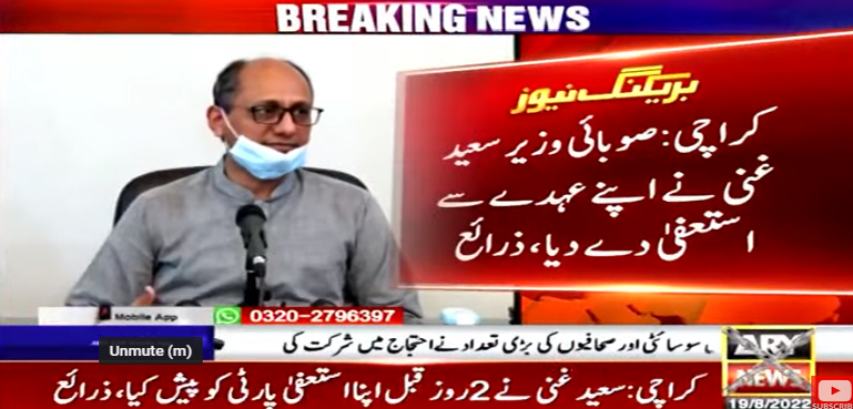 ذرائع نے بتایا کہ سعید غنی جو کہ پی پی پی کراچی کے صدر بھی ہیں بلدیاتی الیکشن کی مہم میں حصہ لینا چاہتے ہیں۔ صوبائی وزیر اطلاعات کے استعفے پر فیصلہ پی پی پی چیئرمین اور وزیر خارجہ بلاول بھٹو زرداری فیصلہ کریں گے۔