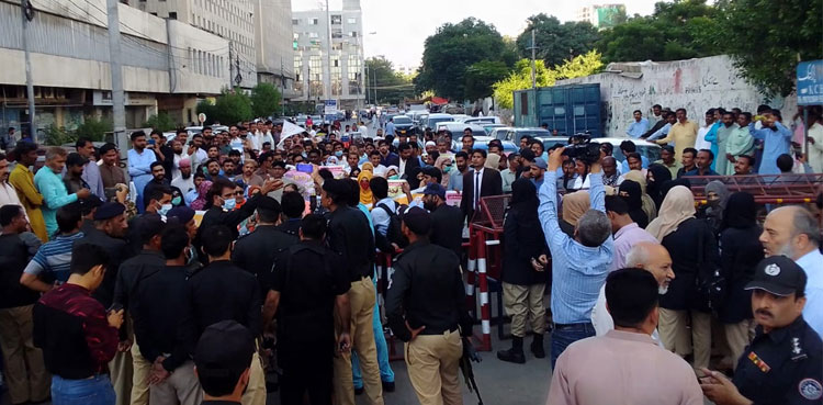تفصیلات کے مطابق کراچی میں سندھ کے مختلف اضلاع سے تعلق رکھنے والے این ٹی ایس پاس اساتذہ نے اپنے مطالبات کے حق میں پریس کلب پر احتجاج کیا۔