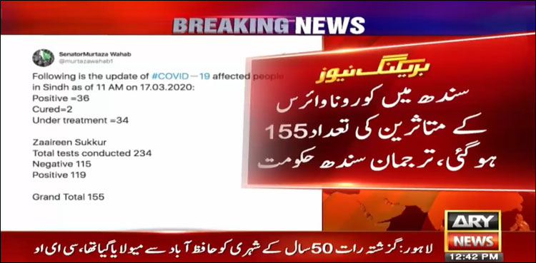 تفصیلات کے مطابق سندھ میں کروناوائرس سے متاثرہ افراد کی تعداد میں اضافے کا سلسلہ جاری ہے ، ترجمان سندھ حکومت بیرسٹرمرتضیٰ وہاب نے سماجی رابطے کی ویب سائٹ ٹوئٹر پر کرونا وائرس کے متاثرین کی تعداد 155 ہونے کی تصدیق کرتے ہوئے کہا سکھر میں موجود 234زائرین کے ٹیسٹ مکمل کرلئے گئے، جس میں سے 119زائرین کے کرونا وائرس ٹیسٹ مثبت آئے جبکہ 115زائرین کے ٹیسٹ منفی ہیں۔