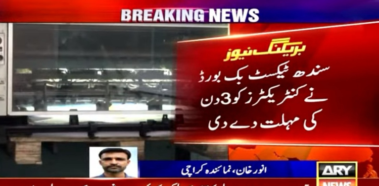 سندھ ٹیکسٹ بک بورڈ نے کنٹریکٹر سے کہا کہ کنٹریکٹرز تین دن کے اندر کتابیں مارکیٹ میں فراہم کریں، اگر کنٹریکٹرز تین دن کے اندر کتابیں فرایم نہیں کرسکے، تو دوسرا کانٹریکٹر رکھ لیں گے۔