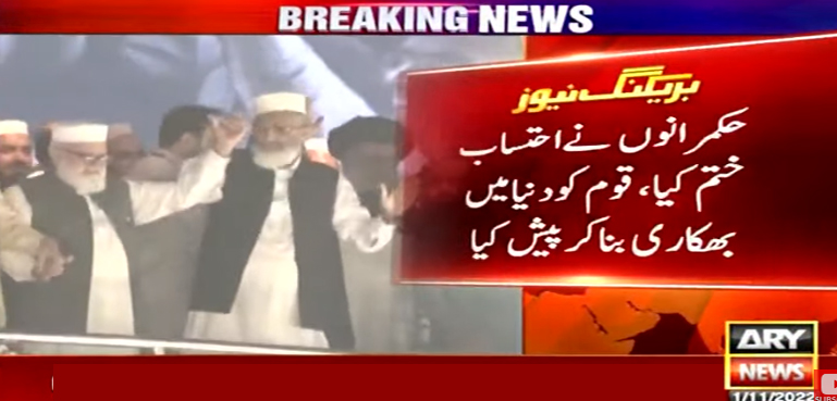 امیر جماعت اسلامی کا کہنا تھا کہ حکمرانوں نے اپنی نسلوں کیلیے مال بنایا جب کہ عوام کو بنیادی اشیا تک سے میسر نہیں ہیں۔