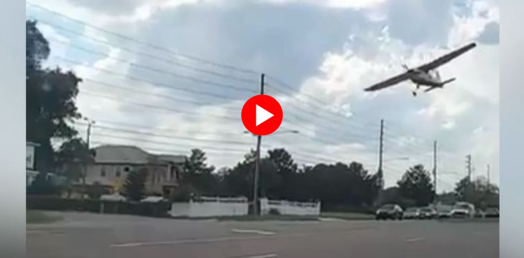 ویڈیو میں دیکھا جاسکتا ہے کہ ایک چھوٹا طیارہ کار ڈرائیور کے سامنے انتہائی نچلی پرواز کرتے ہوئے سڑک پر لینڈنگ کی کوشش کرتا ہے۔