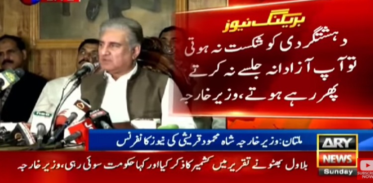 شاہ محمودقریشی نے بلاول کو مخاطب کرتے ہوئے مشورہ دیا کہ وہ بھارت کے بیانیے کوفروغ دینے میں حصے دار نہ بنیں اور ایسے لوگوں سے علیحدگی اختیار کریں۔