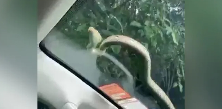 واقعے کی ویڈیو سوشل میڈیا پر وائرل ہوگئی، جس میں دیکھا جاسکتا ہے کہ تیز رفتاری سے چلتی کار کی ونڈ اسکرین پر سانپ نے رینگنا شروع کیا۔
