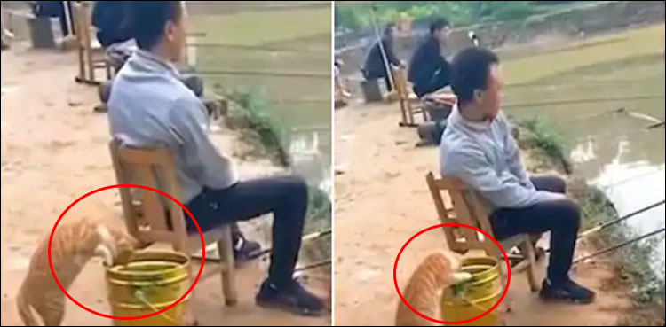 سوشل میڈیا پر وائرل ویڈیومیں دیکھا جاسکتا ہے کہ چین کے صوبے چونگ قنگ کی ایک جھیل سے شکاری مچھلیا پکڑ پکڑ کر بالتی میں ڈال رہا ہے کہ اس دوران اس کے پیچھےسے ایک بلی آہستہ آہستہ آتی ہے اور بالتی میں منہ ڈال دیتی ہے۔