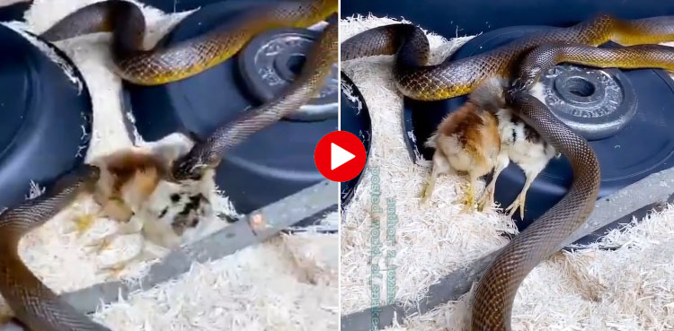 ویڈیو میں دیکھا جاسکتا ہے کہ ایک سانپ نے دو چوزوں کو اپنے منہ میں دبوچ رکھا ہے جب کہ اسی دوران دوسرا سانپ چوزے کو کھانے کی کوشش میں آگے بڑھتا ہے لیکن اس کی یہ کوشش بے سود ثابت ہوتی ہے اور چوزوں کو منہ میں دبوچنے والا سانپ باآسانی انہیں لے جاتا ہے۔