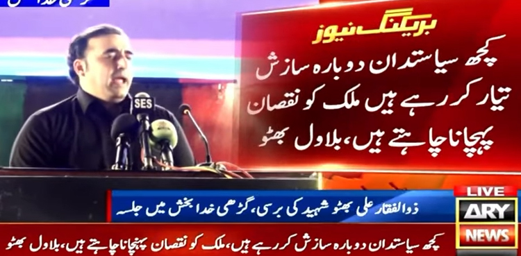 گڑھی خدابخش میں جلسے سے خطاب کرتے ہوئے انہوں نے کہا کہ ذوالفقاربھٹو کےخلاف کچھ سازشی سیاستدانوں نے پی این اے بنائی، سازشی سیاستدانوں کا خیال تھا ذوالفقاربھٹو  کو نکال کر خود حکومت کریں گے ان سازشی سیاستدانوں کی وجہ سے ملک پر 10سال آمریت مسلط رہی اور آج بھی سازشی سیاستدانوں کی وجہ سے ملک کو خطرات ہیں۔
