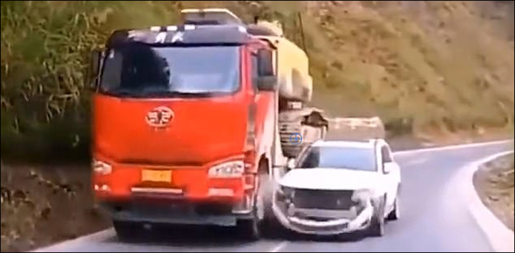 سوشل میڈیا پر وائرل ہونے والی ویڈیو میں دیکھا جاسکتا ہے کہ سڑک پر ایک لال رنگ کا ٹرک اپنی لائن میں حد رفتار پر چل رہا ہے جس پر بھاری بھرکم مشین رکھی ہوئی تھی جبکہ برابر سے ایک سفید رنگ کی جیپ کو تیزی سے آتے دیکھا جاسکتا ہے جو ٹرک کو اوور ٹیک کرنے کا ارادہ رکھتی ہے۔