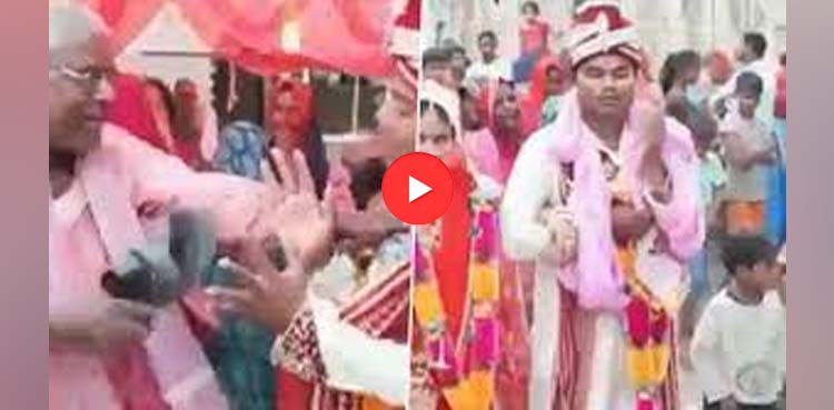 ویڈیو میں دیکھا جاسکتا ہے کہ دولہا ہاتھ جوڑ کر دہائیاں دے رہا ہے لیکن سسر باراتیوں کے سامنے اس کی چپل سے پٹائی کررہے ہیں۔