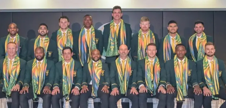 پروٹیز ٹیم کے اراکین کا بھارت روانگی سے قبل گروپ فوٹو سیشن ہوا جس میں کھلاڑیوں نے اپنے گلے میں جنوبی افریقی جھنڈے کے اسکارف پہن رکھے تھے۔