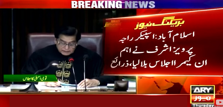 اے آر وائی نیوز کو ذرائع سے ملنے والی اطلاعات کے مطابق اسپیکر قومی اسمبلی راجا پرویز اشرف نے اہم ان کیمرا اجلاس بلا لیا۔ یہ اجلاس کل دوپہر ڈھائی بجے قومی اسمبلی کے ہال میں منعقد ہوگا۔