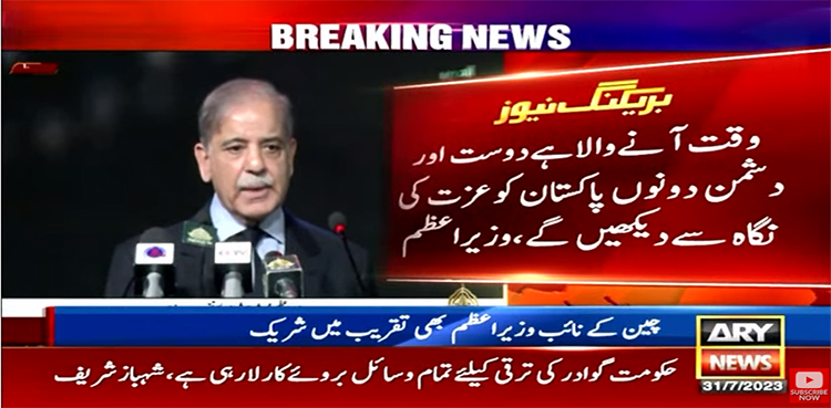 شہبازشریف کا کہنا تھا کہ باجوڑ سانحہ کے باعث سی پیک کی تقریبات کو سادگی سے منا رہے ہیں دہشت گردی کی لعنت کے خاتمے کیلئے مل کر کام کرنا ہو گا، سی پیک کے دوسرے مرحلے میں داخل ہو رہے ہیں سی پیک کا دوسرا مرحلہ نہ صرف پاکستان بلکہ خطےکی ترقی میں اہم کردار ادا کرے گا دوسرے مرحلے میں اسپیشل اکنامک زونز کا قیام عمل میں لایا جا رہا ہے، چین اور پاکستان مل کر سی پیک کے ذریعے فاصلوں کوسمیٹ رہے ہیں گوادر پورٹ آئندہ آنے والے دنوں میں مصروف ترین بندرگاہ ہو گی۔
