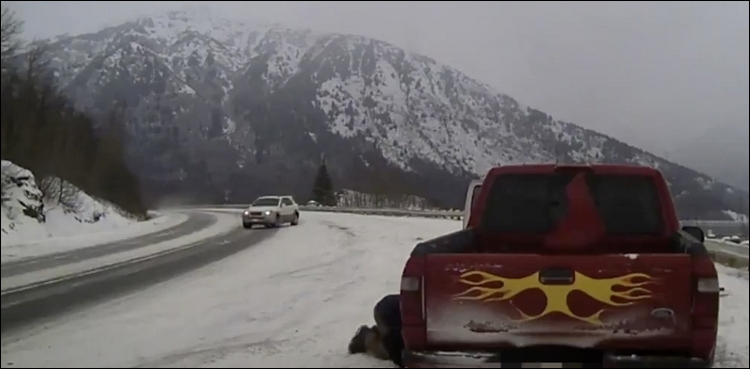 الاسکا، امریکی ریاست الاسکا میں برفیلی سڑک پر ایک شخص خوفناک حادثے سے بال بال بچ گیا۔
