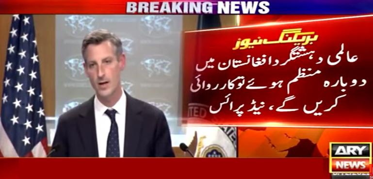 ترجمان امریکی محکمہ خارجہ کا یہ بھی کہنا تھا کہ خطے میں کالعدم ٹی ٹی پی سمیت دیگر گروہوں کو متحرک ہوتے دیکھا ہے۔ دیکھنا ہے کہ دہشتگرد افغانستان کو پاکستان پر حملوں کے لیے بطورلانچ پیڈ استعمال نہ کریں۔ خطے میں شراکت داروں کے ساتھ مل کر کام کرنے کیلیے پرعزم ہیں اور خطے میں دہشتگردی کے خطرات سے نمٹنے کیلیے جو ہوا کریں گے۔