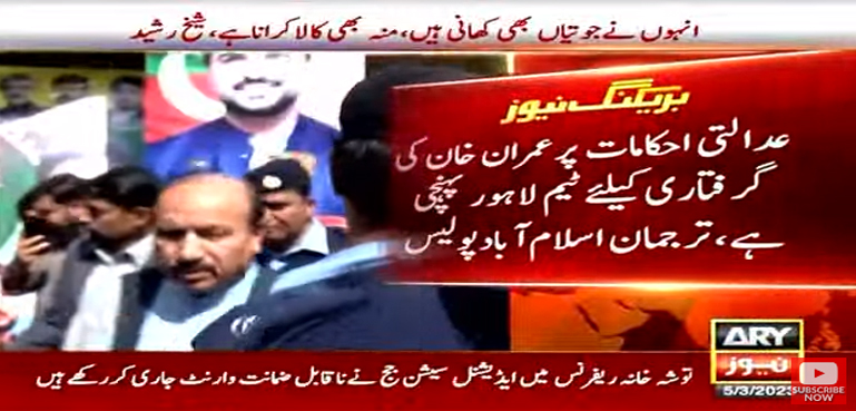اے آر وائی نیوز کے مطابق پاکستان تحریک انصاف کے چیئرمین اور سابق وزیراعظم عمران خان کی گرفتاری کے لیے اسلام آباد پولیس زمان پارک لاہور پہنچ گئی ہے۔ وفاقی پولیس کی ٹیم ایس پی سٹی اسلام آباد حسین طاہر کی سربراہی میں پہنچی ہے۔