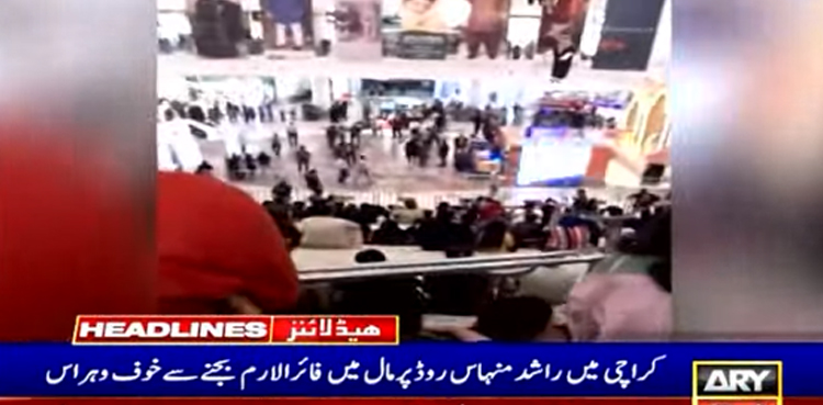 تفصیلات کے مطابق کراچی میں راشد منہاس روڈ پر واقع مال میں فائرالارم بجنے سے خوف وہراس پھیل گیا، الارم بجتے ہی شاپنگ کی غرض سے آئے شہری بھاگ کھڑے ہوئے۔