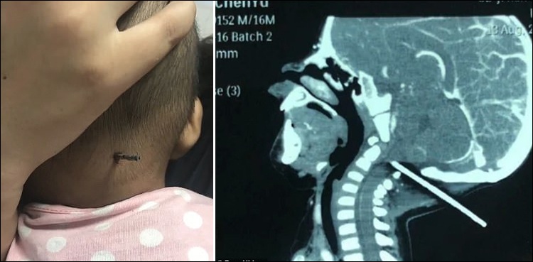 غیر ملکی میڈیا کے مطابق چین کے صوبے شینگڈانگ کے شہر جینان میں ایک سالہ بچہ کھیل کے دوران پشت کے بل گرنے سے اس کی کھوپڑی کے پچھلے حصے میں اسٹیل کی راڈ گھس گئی لیکن وہ موت کے منہ میں جانے سے بچ گیا۔