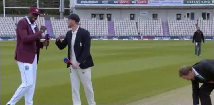 ساؤتھمپٹن: انگلینڈ اور ویسٹ انڈیز کی ٹیمیں پہلے ٹیسٹ میچ میں مدمقابل ہیں لیکن ٹاس کے وقت دلچسپ واقعہ پیش آیا جب ویسٹ انڈین کپتان جیسن ہولڈر کرونا کی ایس او پیز بھول گئے۔
