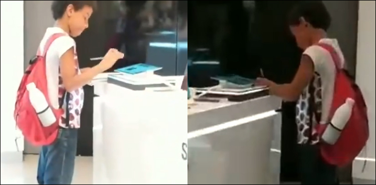 انٹرنیٹ پر وائرل ہونے والی ویڈیو میں دیکھا جاسکتا ہے کہ دس سال کا طالب علم اسٹال پرنصب ٹیبلیٹ پر انٹرنیٹ استعمال کررہا اور وہاں سے چیزیں نوٹ کر کے انہیں کاپی میں لکھ رہا ہے۔