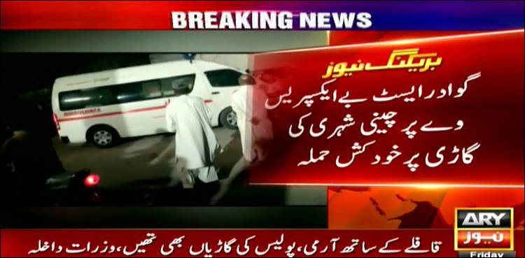 وزارت داخلہ کے مطابق گوادر ایسٹ بےایکسپریس وے پر چینی قافلے پر خودکش حملہ کیا گیا، ‏قافلہ 4گاڑیوں پرمشتمل تھا، قافلے کے ساتھ آرمی اور پولیس کی گاڑیاں بھی تھیں۔