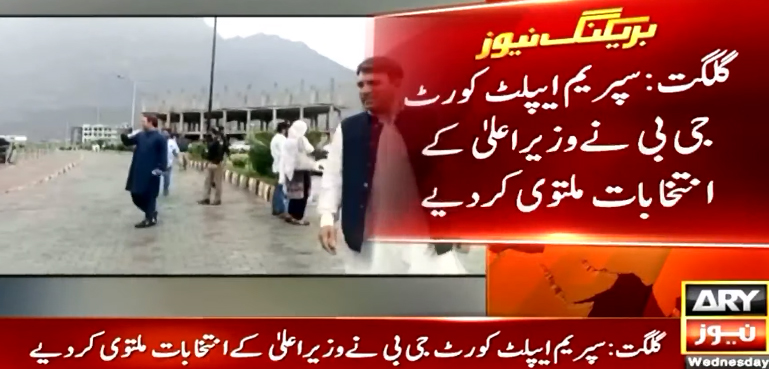 اے آر وائی نیوز کے مطابق گلگت بلتستان کی سپریم اپیلٹ کورٹ نے وزیراعلیٰ جی بی انتخابات ملتوی کر دیے ہیں۔ گزشتہ روز جعلی ڈگری کیس میں پی ٹی آئی کے وزیراعلیٰ خالد خورشید کے نا اہل ہونے کے بعد نئے وزیراعلیٰ کا انتخاب ہونا تھا۔