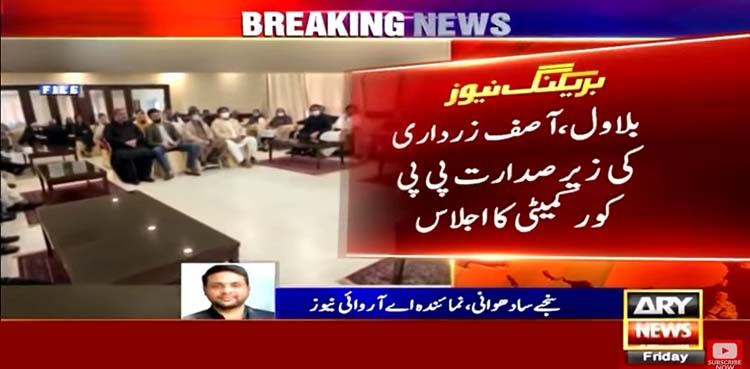 نمائندہ اے آر وائی نیوز کے مطابق چیئرمین بلاول بھٹو اور آصف زرداری کی زیرصدارت پی پی کورکمیٹی کا اجلاس ہوا جس میں بات چیت کیلئےحکومت میں شامل جماعتوں سے رجوع کرنے کا فیصلہ کیا گیا۔