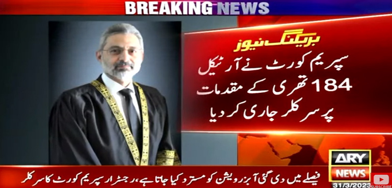 اے آر وائی نیوز کے مطابق سپریم کورٹ نے آرٹیکل 184 تھری کے مقدمات پر سرکلر جاری کر دیا ہے جس میں کہا گیا ہے کہ جسٹس فائز عیسیٰ کے فیصلے میں ازخود نوٹس کا اختیار استعمال کیا گیا۔