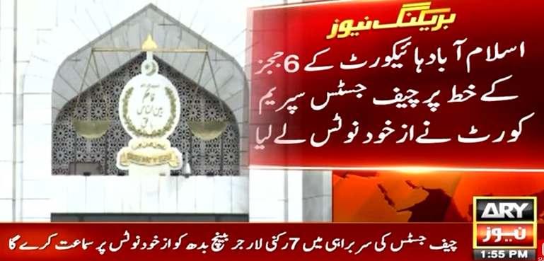 اسلام آباد ہائی کورٹ کے 6 ججز کے خط پر چیف جسٹس سپریم کورٹ نے ازخود نوٹس لیتے ہوئے 7 رکنی لارجر بینچ تشکیل دے دیا ہے۔