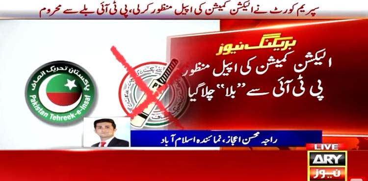 اے آر وائی نیوز کے مطابق سپریم کورٹ نے الیکشن کمیشن کی اپیل منظور کرتے ہوئے پشاور ہائی کورٹ کا فیصلہ کالعدم قرار دے دیا جس کے بعد پی ٹی آئی کو ’بلے‘ کا انتخابی نشان نہیں ملے گا۔