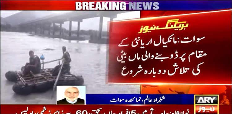 ریسکیو کے غوطہ خور دریائے سوات میں ماں بیٹی کی تلاش میں مصروف ہیں، ریسکیو اہلکاروں نے تلاش کا آپریشن بحرین آریہ سے شروع کیا ہے، اس سے قبل بحرین سے ڈھارہ پارک تک سرچ آپریشن کیا گیا تھا۔