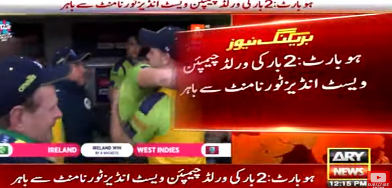 آسٹریلیا کے شہر ہوبارٹ میں کھیلے جا رہے میچ آئرلینڈ نے دو بار کی عالمی چیمپئن کو با آسانی 9 وکٹوں سے شکست دی ویسٹ انڈین بولر اپنے بلے بازوں کی جانب سے دیے گئے ہدف 147 رنز کا تحفظ نہ کرسکے اور مخالف ٹیم نے 147 رنز کا ہدف صرف ایک وکٹ کے نقصان پر اٹھارویں اوور میں 15 گیندیں قبل ہی حاصل کرلیا۔