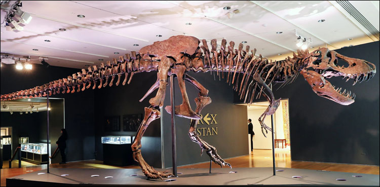 نیویارک کے نیلام گھر کرسٹیز میں ٹی ریکس کا فوسل 3 کروڑ 18 لاکھ ڈالر کی ریکارڈ رقم میں فروخت ہو گیا، فروخت ہونے والے فوسل کی ابتدائی قیمت 60 سے 80 لاکھ لگائی گئی تاہم یہ ریکارڈ قیمت پر فروخت ہوا اور اس کی نیلامی سے ڈائنا سور کے ڈھانچوں کی نیلامی کا نیا ریکارڈ بھی بنا۔