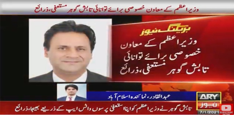 اسلام آباد: وزیراعظم کے معاون خصوصی برائے توانائی تابش گوہر مستعفی ہوگئے ہیں۔