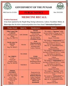 الرٹ میں کہا گیا ہے کہ غیر معیاری سسپنشن کے استعمال سے مریض کی حالت بگڑ سکتی ہے، اور علاج متاثر ہو سکتا ہے، یہ ایس این بی فارما پشاور کا تیار کردہ سسپشن ہے، اور اس کے متاثرہ بیچ کی سپلائی پر پابندی لگا دی گئی ہے۔