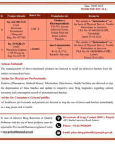 الرٹ کے مطابق میبزول (Mebzole) سسپنشن 100 ایم جی کے دو بیچ اور بائیو رِس (Bioris) اورل سلوشن 1 ایم جی کا ایک بیچ غیر معیاری اور نقصان دہ قرار دیے گئے ہیں۔