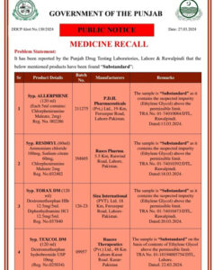 ڈمپیریڈون فارمولے کی دوا میبزول قے کے لیے استعمال ہوتی ہے، اس کے دو بیچ 22J022F،B غیر معیاری نکلے ہیں، جب کہ سکیزوفرینیا (ذہنی مرض) کے لیے استعمال ہونے والی دوا بائیو رِس کا ایک بیچ 23B061 غیر معیاری نکلا ہے۔