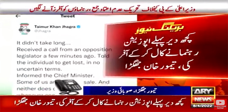 اے آر وائی نیوز سے گفتگو کرتے ہوئے تیمور جھگڑا نے کہا کہ اپوزیشن رہنما کی آفر کی کال سے وزیراعلیٰ کو بھی آگاہ کر دیا ہے ہر کوئی بکاؤ نہیں ہوتا نہ ہی موقع ملتے ہی ہمارا ضمیرجاگتاہے۔
