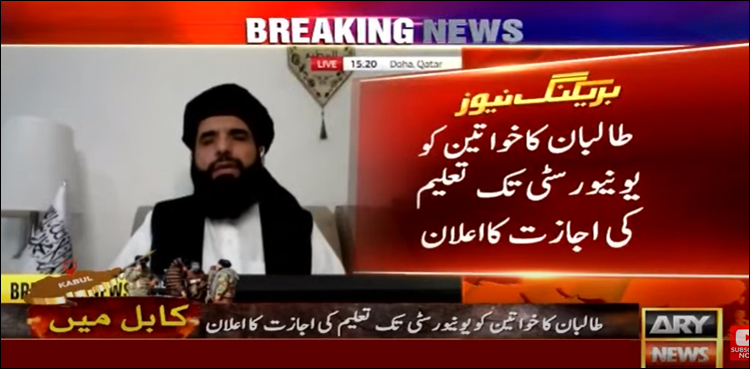 اے آر وائی نیوز کے مطابق ترجمان افغان طالبان سہیل شاہین نے امریکی چینل اسکائی نیوز کو انٹرویو کے دوران خواتین کو یونیورسٹی تک تعلیم کی اجازت دینے کا اعلان کیا۔