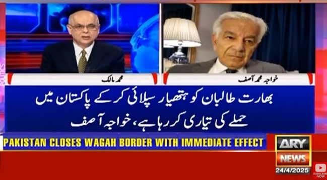 اے آروائی نیوز کے پروگرام ’خبر‘ میں گفتگو کرتے ہوئے خواجہ آصف نے کہا کہ ہمارے پاس انٹیلی جنس ہیں کہ بھارت پاکستان میں حملے کی تیاری کر رہا ہے رپورٹس ہیں کہ بھارت آئی ای ڈیز اور دیگر ہتھیار فراہم کر رہا ہے اور وہ ٹی ٹی پی کے ذریعے اہم شہروں کو نشانہ بنائےگا۔