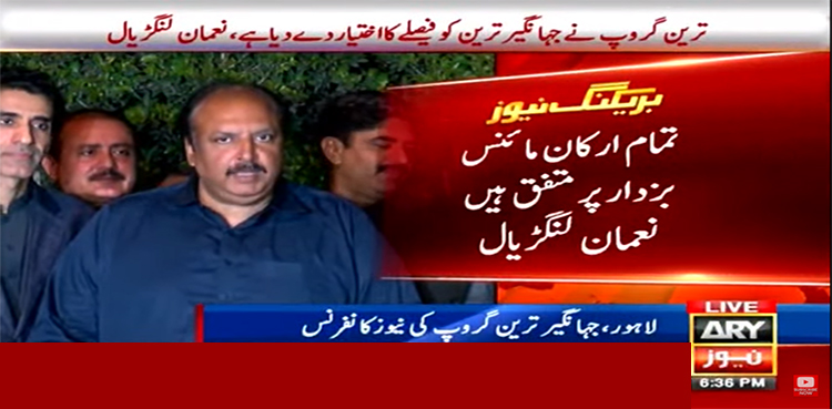 نعمان لنگڑیال نے کہا کہ جہانگیرترین جس قسم کابھی فیصلہ کرینگےان کیساتھ چلیں گے علیم خان نےکل ہمارے گروپ کو جوائن کیا ہے جہانگیرترین جوفیصلہ کریں گےوہ سب کو قبول ہوگا ہم جہانگیرترین کی لیڈرشپ میں متفق ہیں علیم خان کوبھی کہاگروپ کا حصہ ہیں تو جہانگیرترین کے فیصلوں کےپابندہوں گے۔