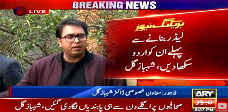 وزیراعظم کے معاون خصوصی برائے سیاسی روابط شہباز گل نے  لاہور میں میڈیا سے گفتگو کرتے ہوئے کہا کہ ہمیں تو انگریزی سننے کو نہیں ملتی تھی اسے تو 24 گھنٹے اردو سننے کو ملتی ہے اس کو لیڈر بنانے سے قبل اردو سکھا دیں۔