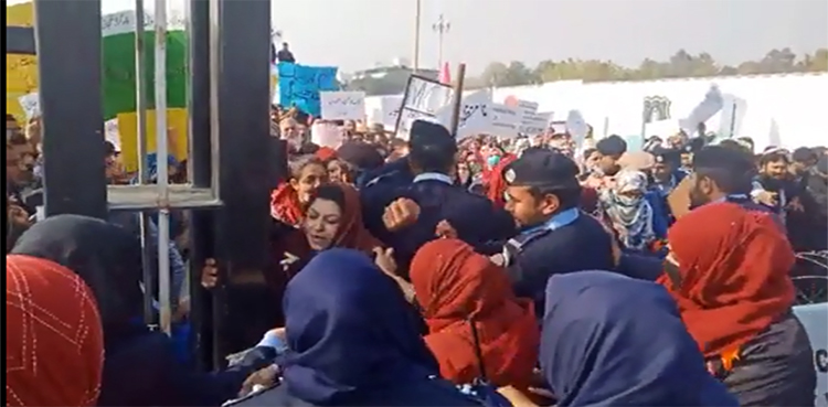 اس موقع پر مظاہرین نے رکاوٹیں ہٹانے کی کوشش کی تو پولیس نے مظاہرین کو روکنے کے لیے لاٹھی چارج کردیا، اساتذہ نے حکومت کے خلاف شدید نعرے بازی بھی کی، مظاہرین بیرئر اور خاردار تاریں ہٹاکر پارلیمنٹ ہاؤس کے باہر بھی پہنچ چکے ہیں۔