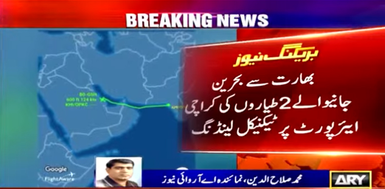 تفصیلات کے مطابق بھارت سے بحرین جانیوالے 2 طیاروں نے کراچی ایئرپورٹ پر ٹیکنیکل لینڈنگ کی۔