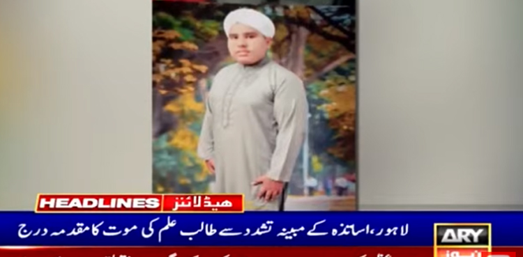 لاہور : مدرسے میں ساتذہ کے مبینہ تشدد سے چودہ سالہ طالب علم جاں بحق ہوگیا ، پولیس نے مدرسہ کی انتظامیہ کے خلاف مقدمہ درج کرلیا ہے۔